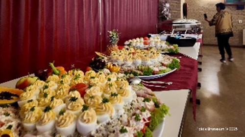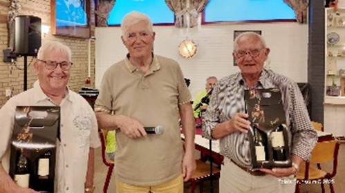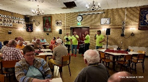 Het was gezellig napraten op het zonnige terras. In Concordia sloten een klein aantal leden zich aan om het avondprogramma mee te maken. De leden genoten van een smakelijk warm-koud buffet dat keurig werd gepresenteerd door good old Van de Broek, bij ons beter bekend als het Het Smulhuis! Voorzitter Karel van Knippenberg sprak in zijn toespraak over het vele werk dat door de jaren heen is verzet. Wat in 25 jaar is verzameld, zit nu in tientallen dozen en kasten waar niemand het kan zien. De belangrijke taak van de huidige vereniging is dan ook volgens Karel dat het nu tijd is om de deuren te openen en de collectie te tonen aan de Brunssumer. Helaas was een aantal bestuursleden uit den beginne niet aanwezig. Twee leden, te weten Frans Cals en Guus Alofs, werden extra bedankt voor hun werk. Zij ontvingen een koppel wijn! De gezelligheid groeide naarmate de avond vorderde. Mede schuldig hieraan was het optreden van 4 zangers van het Zeemgilde uit Merkelbeek.